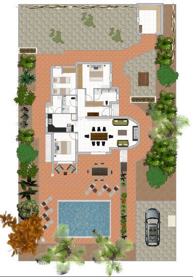 Auf den zwei großen Terrassen mit unterschiedlichen Ebenen kann man in aller Ruhe auf den Liegen in der Sonne entspannen. Der 8x10 Meter große und 1-2 Meter tiefe Pool verfügt über eine Gegenstromanlage und Massagedüsen zum relaxen. Eine Außendusche befindet sich ebenfalls in poolnähe, damit das Baden im Pool sauber verläuft.